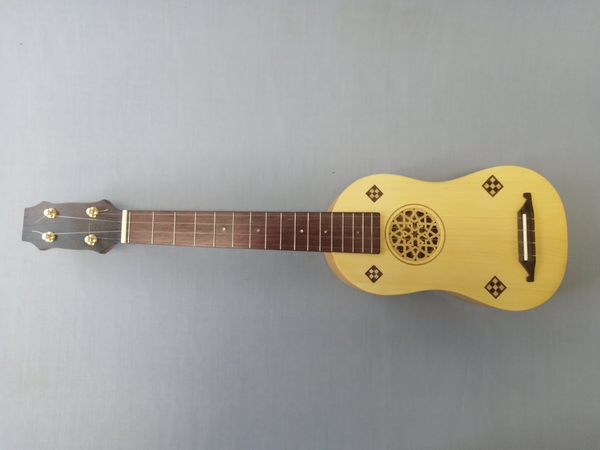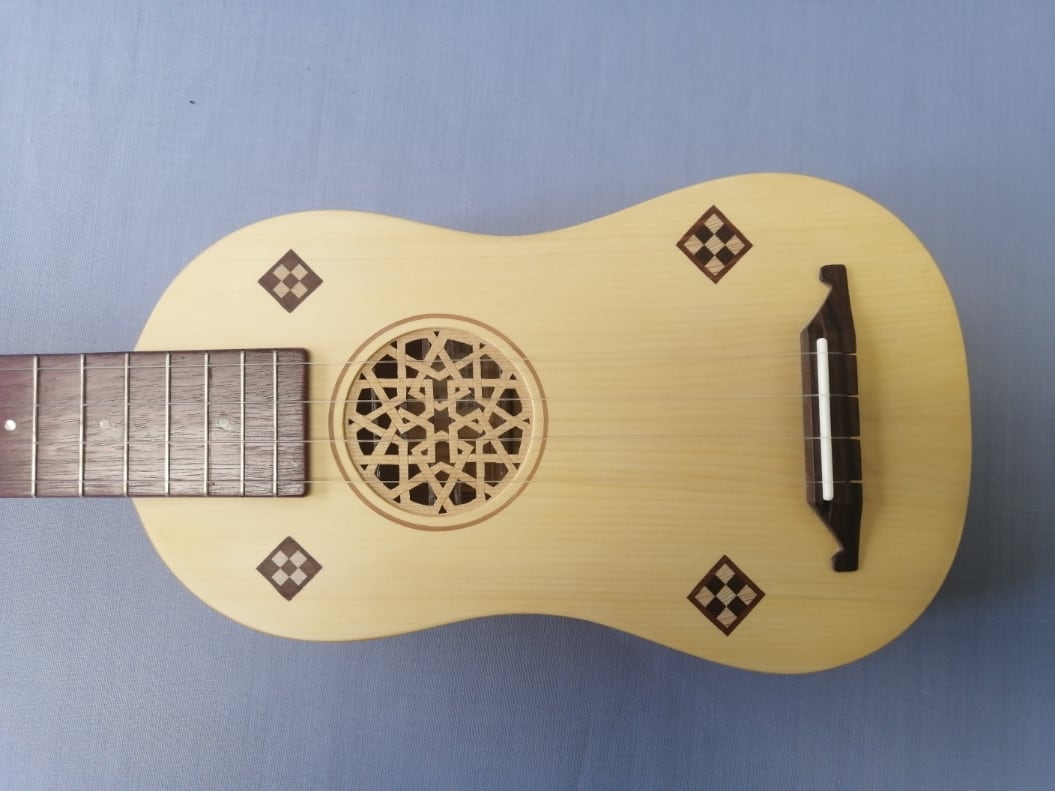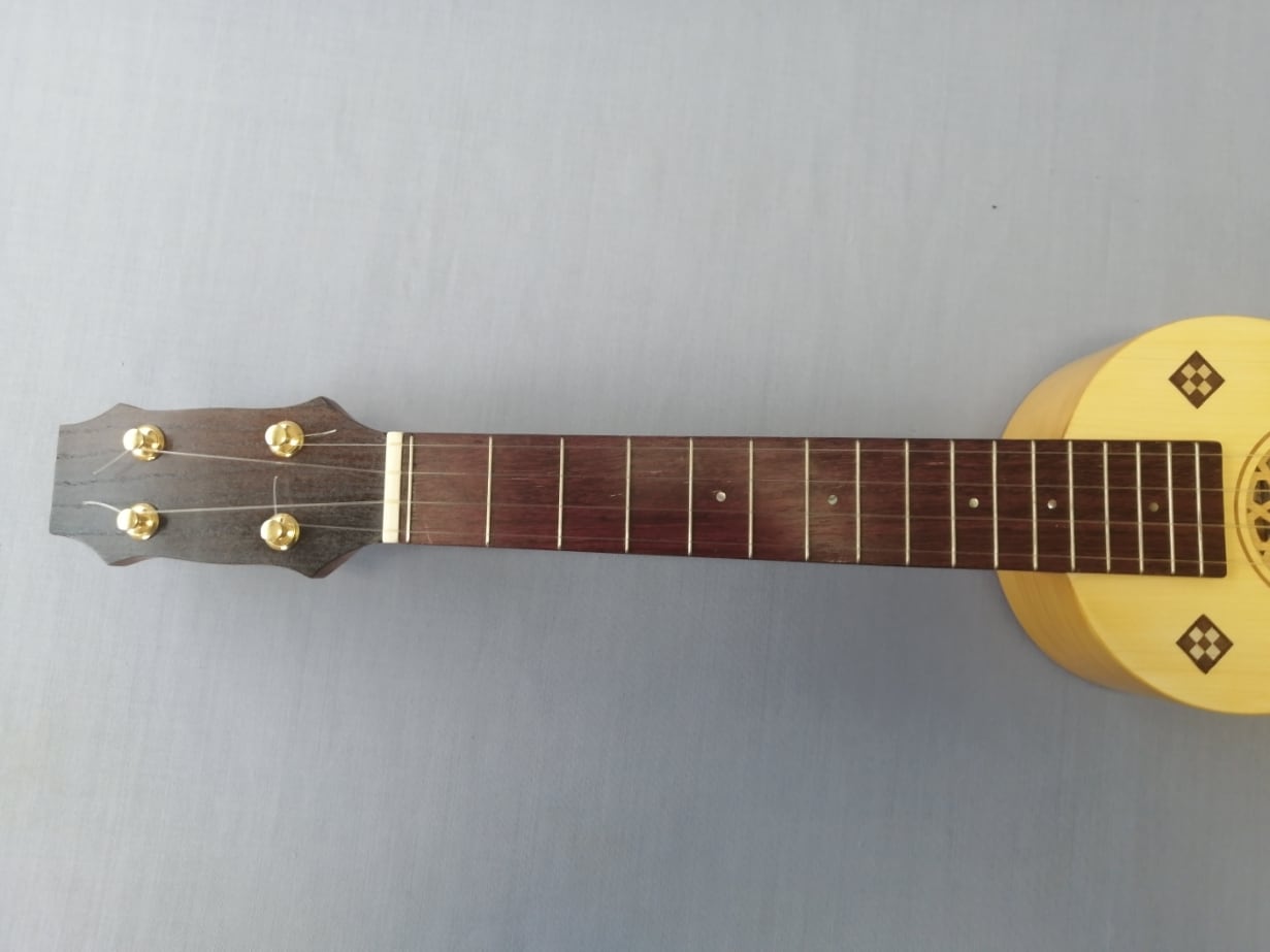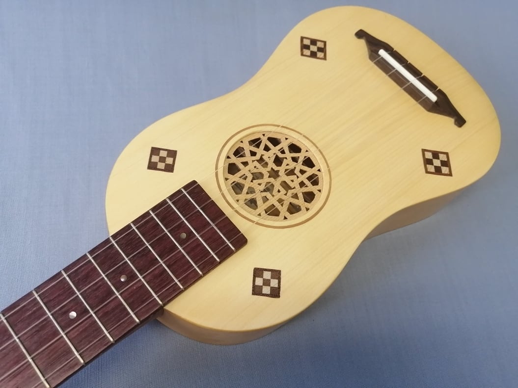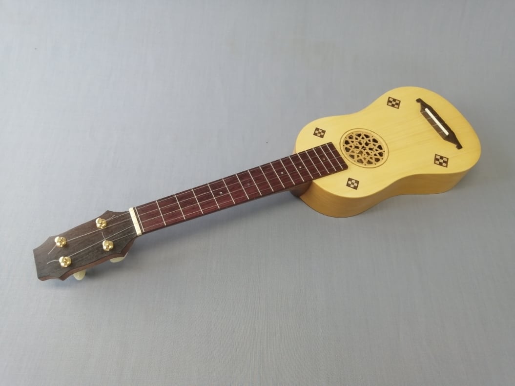 ・16世紀スペインで生まれたギターに、ビウエラ(6コースギター)とルネサンスギター(4コースギター)があります。現代のギターやウクレレの最も古い祖先と考えらています。今回出品のウクレレは、ビウエラのデザインをもとに製作したウクレレです。写真の最後の一枚が16世紀のビウエラの絵です。一十舎以外にこのような古楽器風のウクレレを製作しているところはないと思うので、とても希少な一本です。