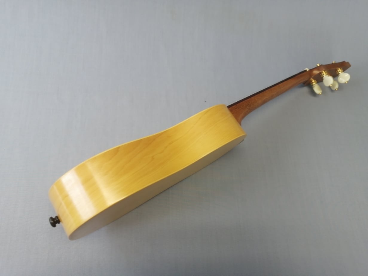 デモ演奏はこちらのページでどうぞ。本器そのものの演奏ではないですが、同じ材、同じ大きさ、同じ形で作ったウクレレ(装飾があるかないかだけが違うところ)ですので、音は基本的に同じ傾向で、キレのある明るい音です。
