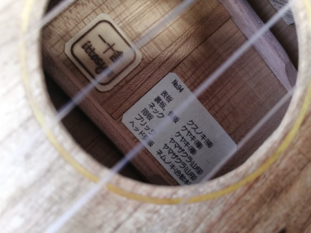 ・今回は、ボディ全体(表板・裏板・側板)にクスノキ(楠)材、ネックにケヤキ(欅)材、指板とブリッジにヤマザクラ(山桜)材、ヘッド突板にネムノキ(合歓木)材を使用。