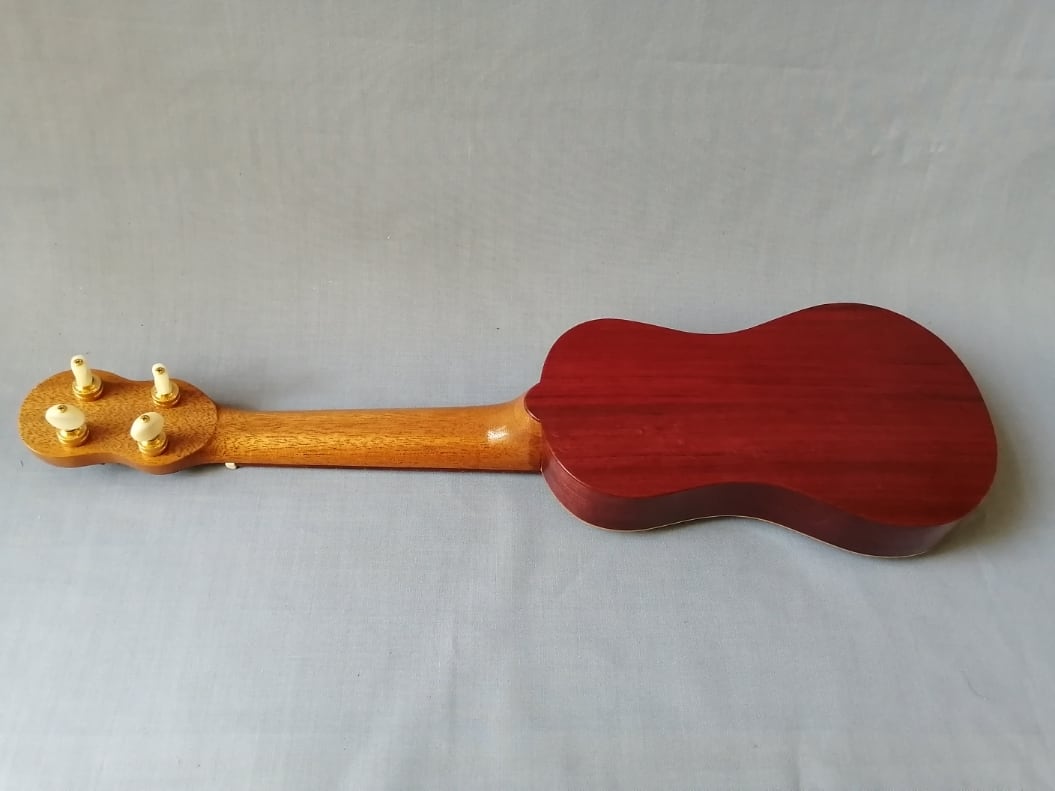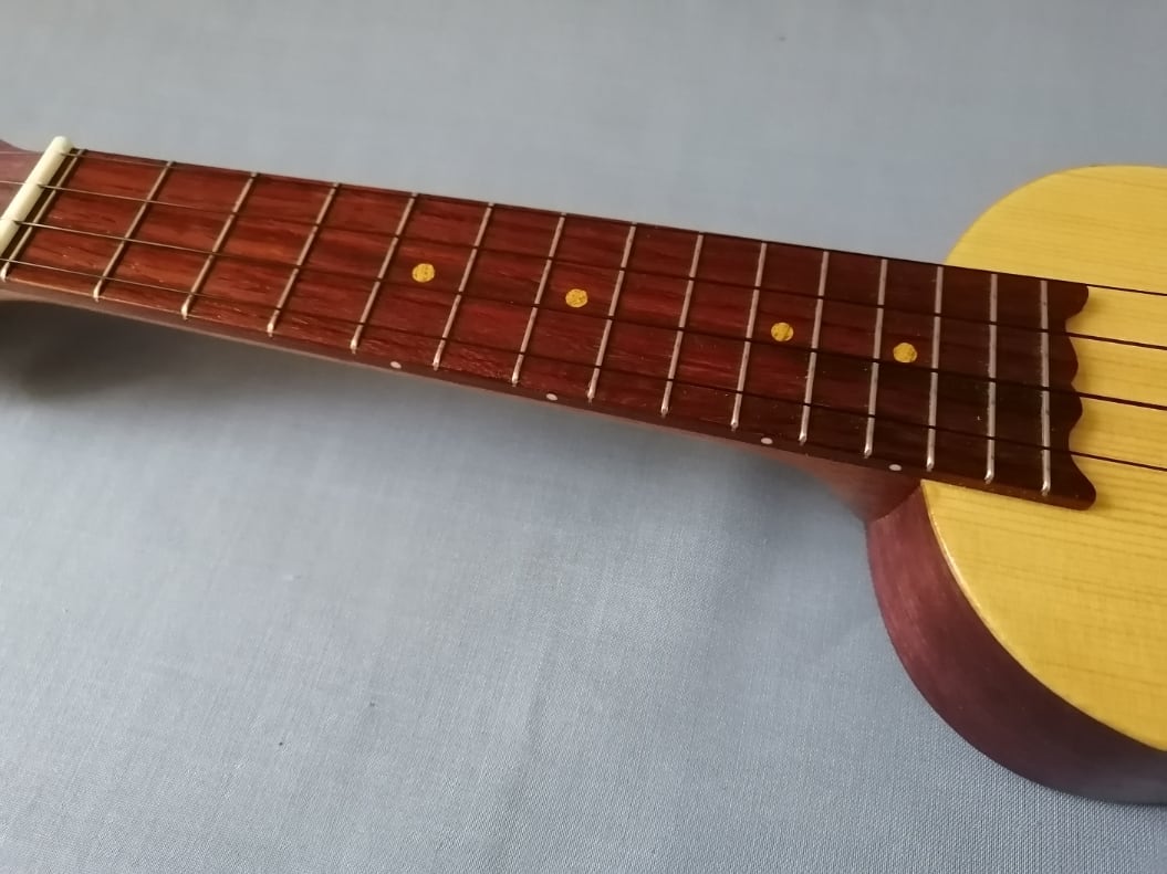 当舎のウクレレはボディ厚(トップとバック間の距離)が一般のウクレレの3/4くらいのウスレレとなっています。穏やかで素朴な響き、音の反応が良くかつ深みもある、そんな厚みです。それは古楽器の時代の形態に近づくことにもなり、音の原点回帰的な魅力ともなりました。持ちやすく、運びやすく、演奏性もよく、音楽が身近に寄り添う魅力があと考えています。