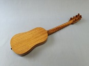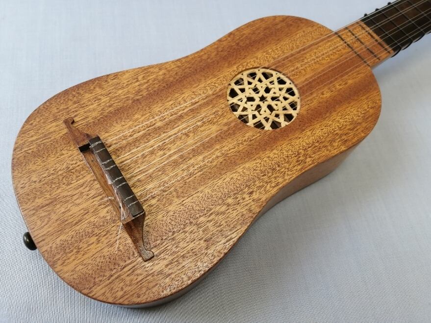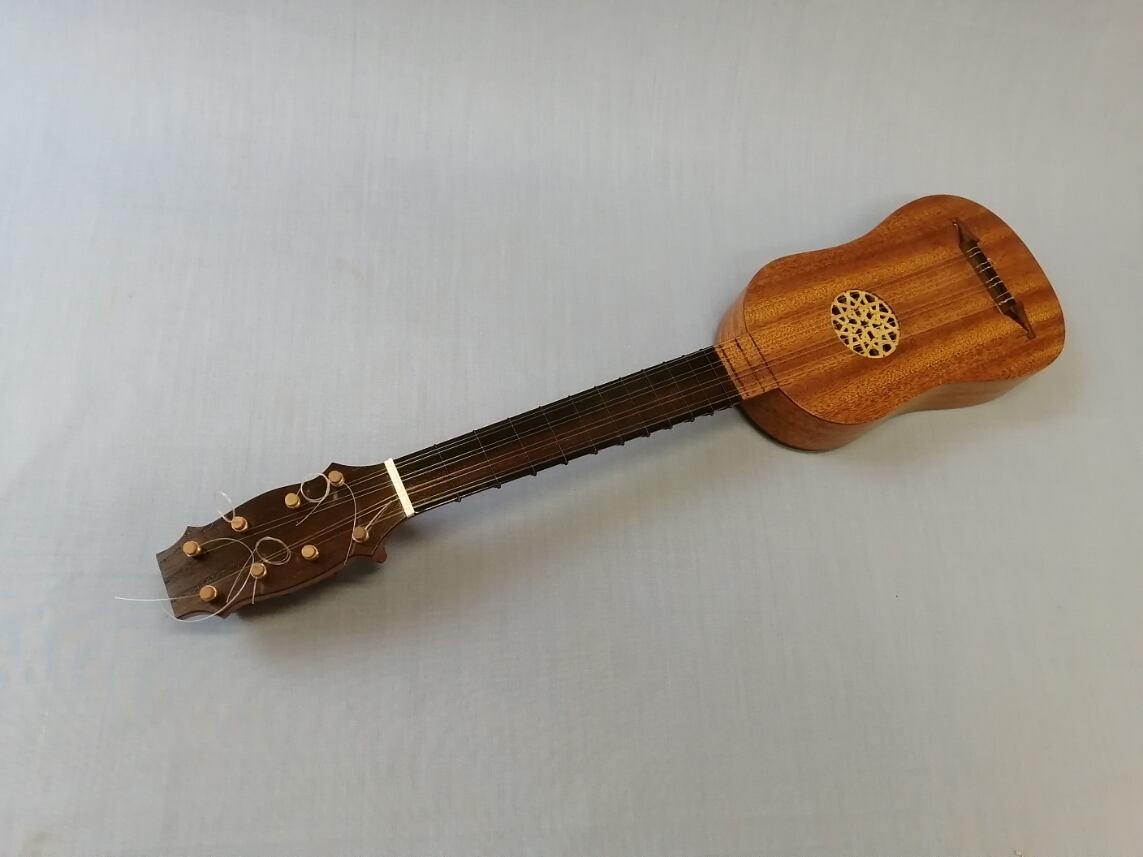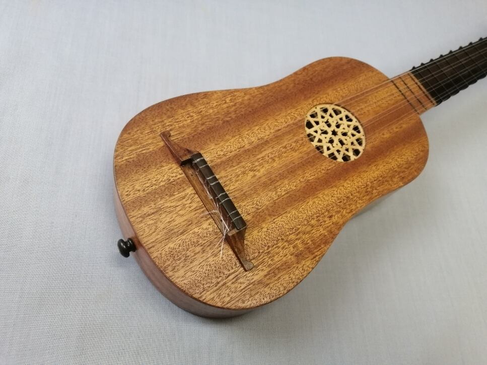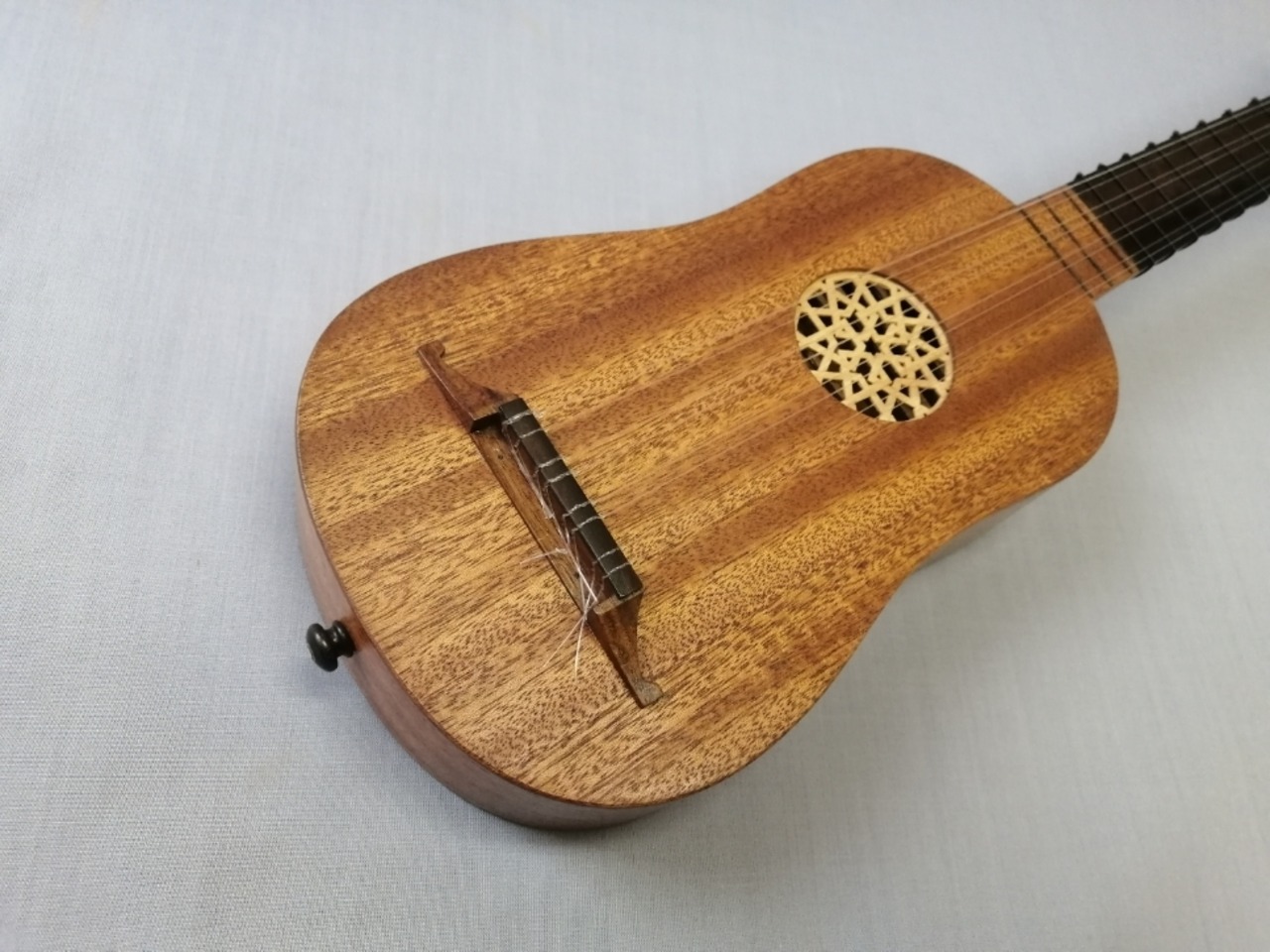 ルネサンスギターとは、イベリア半島起源と推測される、およそ16世紀から18世紀ころにかけてヨーロッパで広く弾かれた4コースギターです。ウクレレの最も古い祖先と考えられます。合計7本又は8本の弦を4つのコースに振り分け、調弦は4コースから順にGCEAとすることが一般です(一番下側の1コースは単弦又は複弦のユニゾン、2コースと3コースは複弦ユニゾン、4コースは複弦オクターブとすることが多いです)。このGCEAの調弦はウクレレと同じなので、現代人にも大変馴染みやすい古楽器です。
