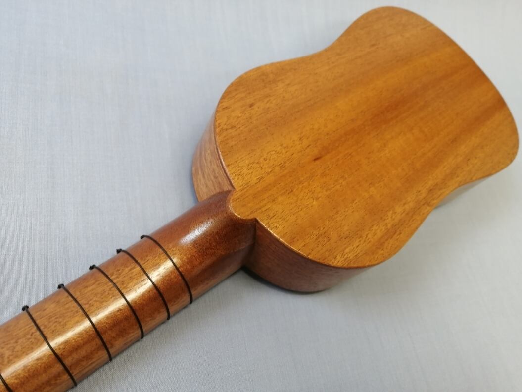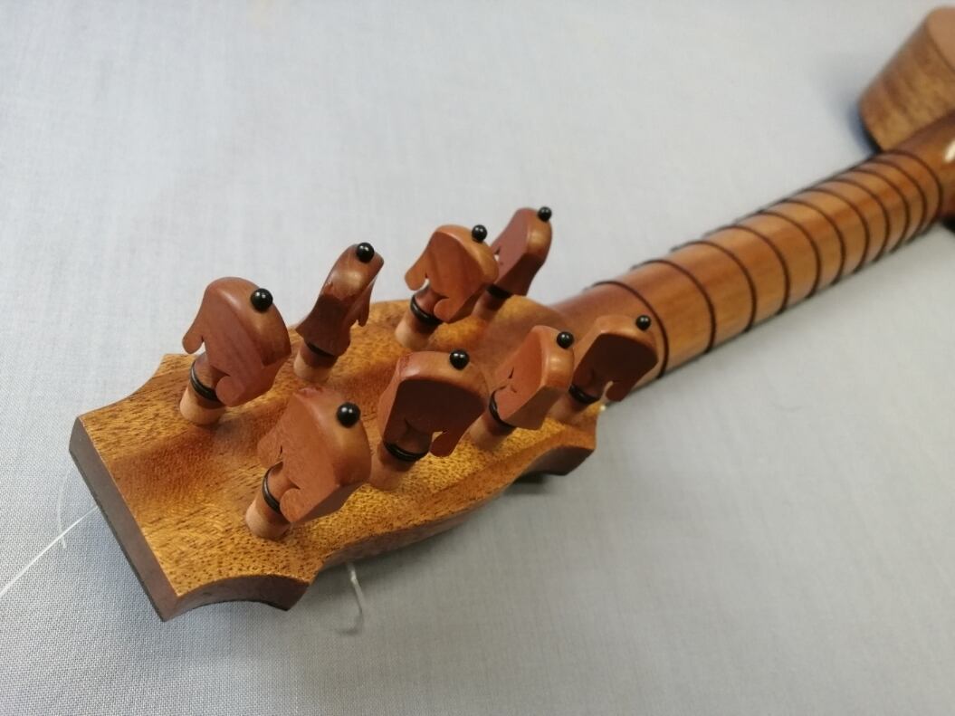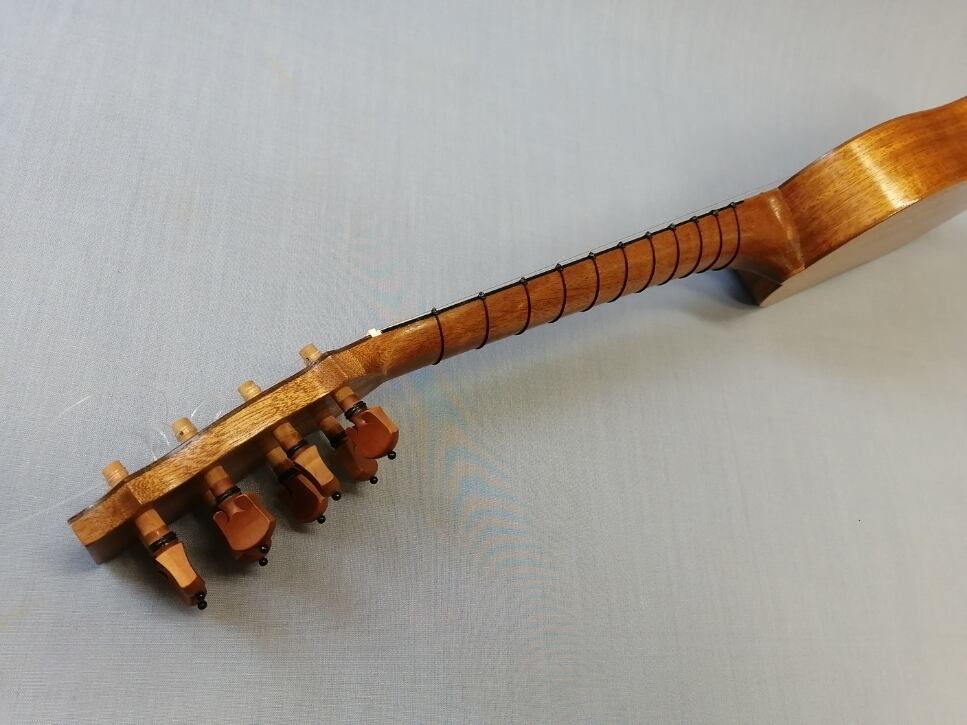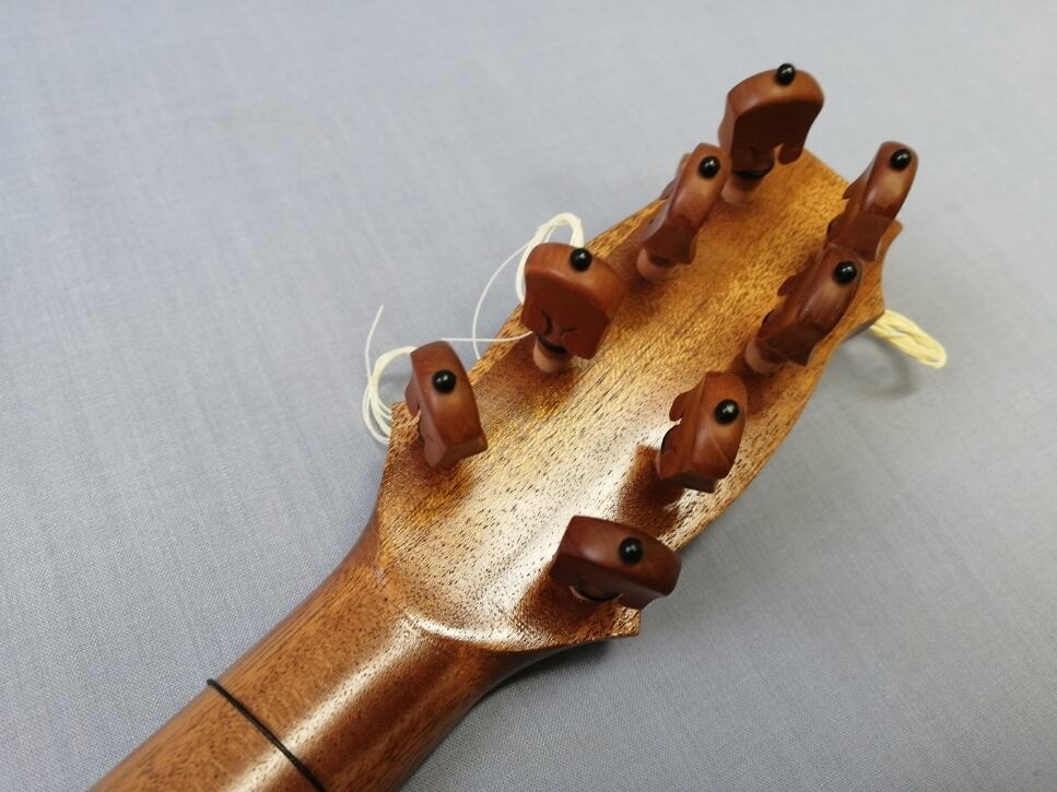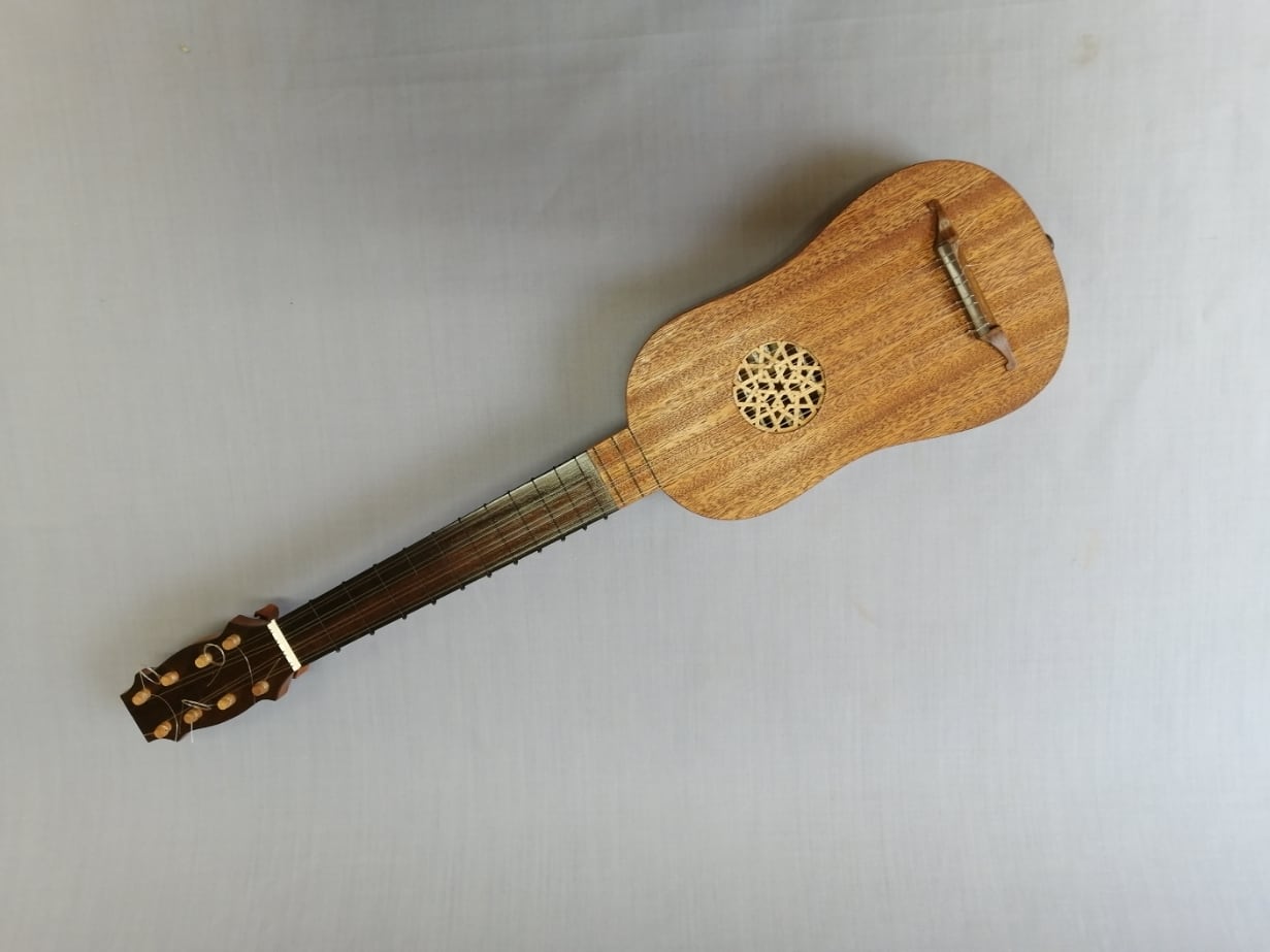 ルネサンスギターとは、イベリア半島起源と推測される、およそ16世紀から18世紀ころにかけてヨーロッパで広く弾かれた4コースギターです。ウクレレの最も古い祖先と考えられます。合計7本又は8本の弦を4つのコースに振り分け、調弦は4コースから順にGCEAとすることが一般です(一番下側の1コースは単弦又は複弦のユニゾン、2コースと3コースは複弦ユニゾン、4コースは複弦オクターブとすることが多いです)。このGCEAの調弦はウクレレと同じなので、現代人にも大変馴染みやすい古楽器です。