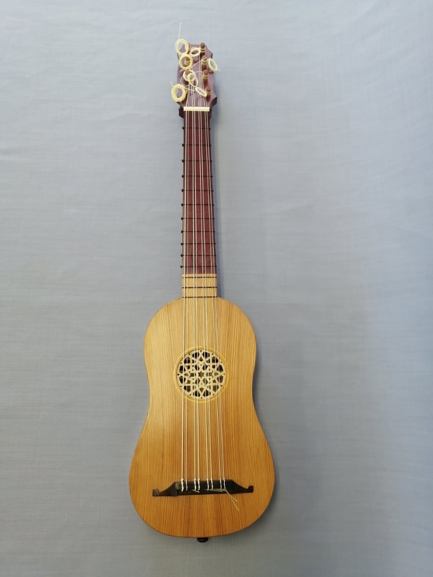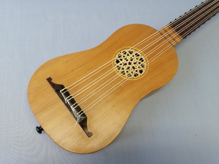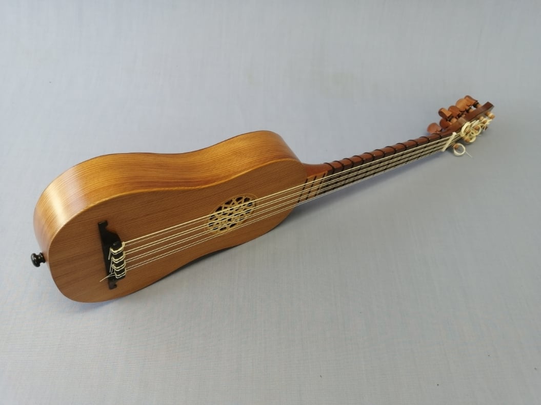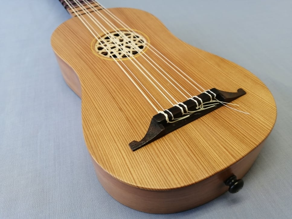 ルネサンスギターとは、16世紀頃スペイン付近起源のヨーロッパに広がった4コースの複弦ギターです。現代ギターやウクレレなどの古い祖先と考えられます。合計7本又は8本の弦を4つのコースに振り分け、調弦は4コースから順にGCEAとすることが一般です。このGCEAの調弦はウクレレと同じなので、現代人にも大変馴染みやすい古楽器です。