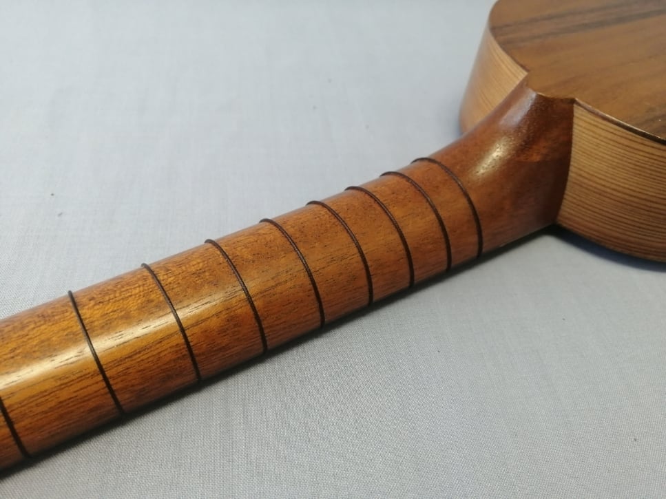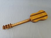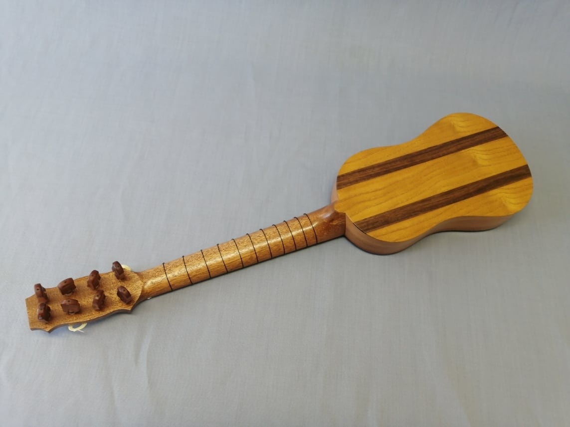 このルネサンスギターは、1733年にフロリダ沖で暴風によって難破したスペイン船の海底にあったギター残骸からの復元図面をもとに製作したものです。船に携行するギターのためか、コンサートウクレレほどの小型ボディになっており、それにウクレレよりはかなり長めのネックが付いているのが特徴です。
